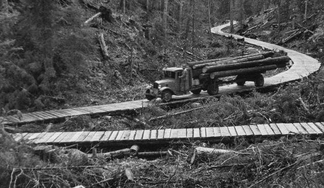 新砍下的庞大的原木,被砍木匠人们从山上通过牛、卡车、雪橇、滑道、铁等各类东西运送到水里,到1930年,每年一半的木材收入都来自于不列的颠哥伦比亚省。